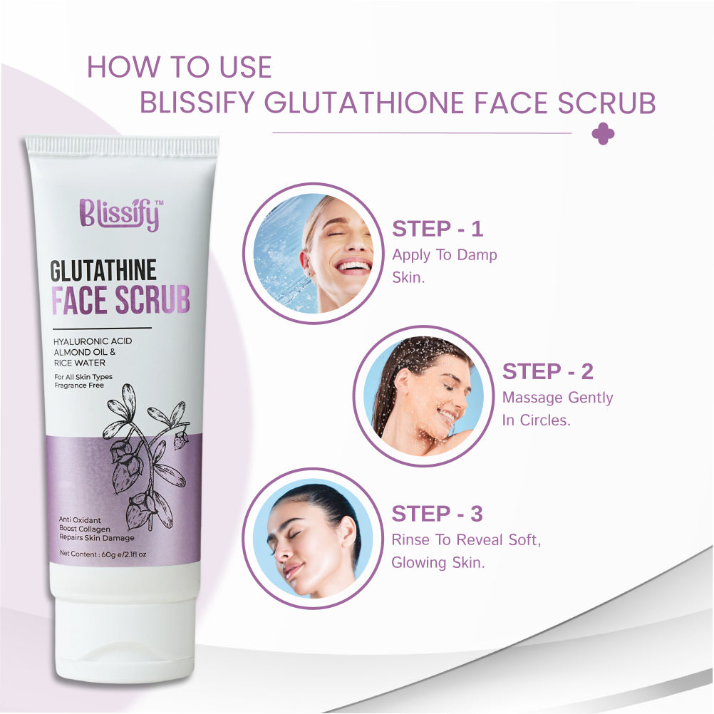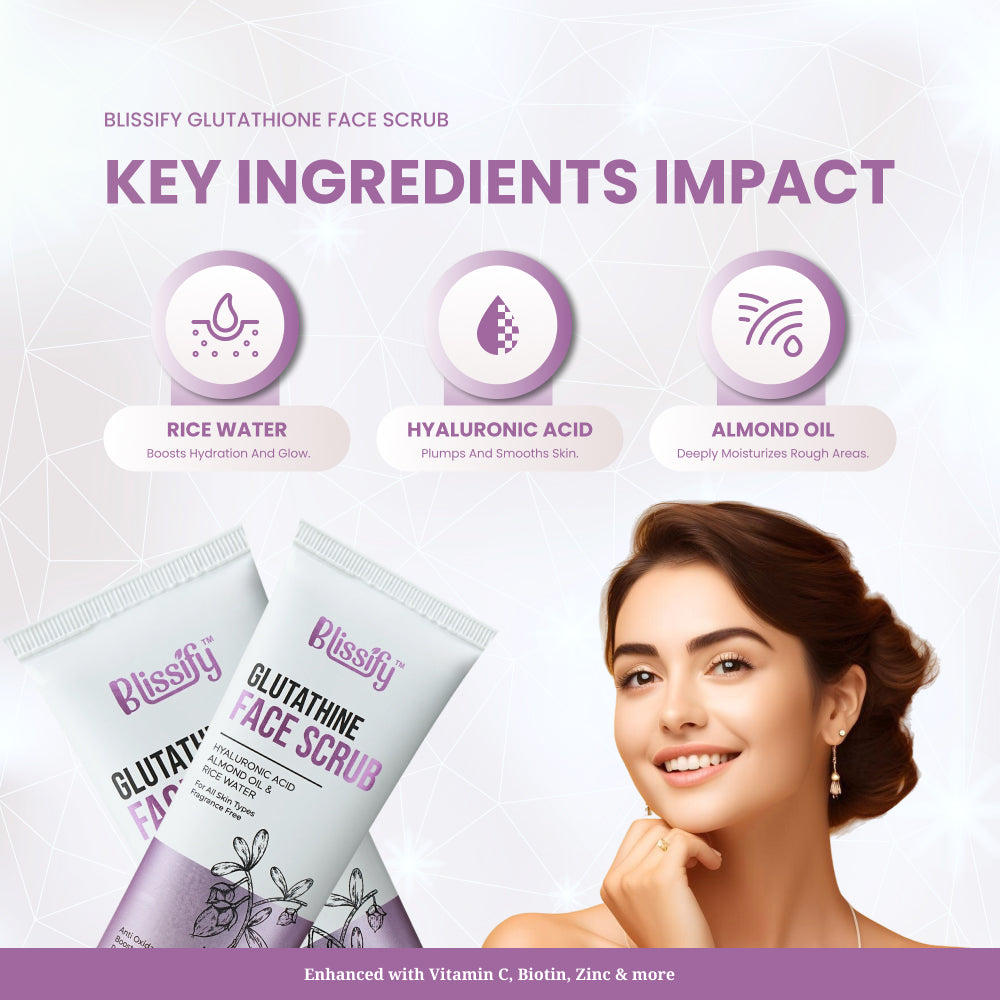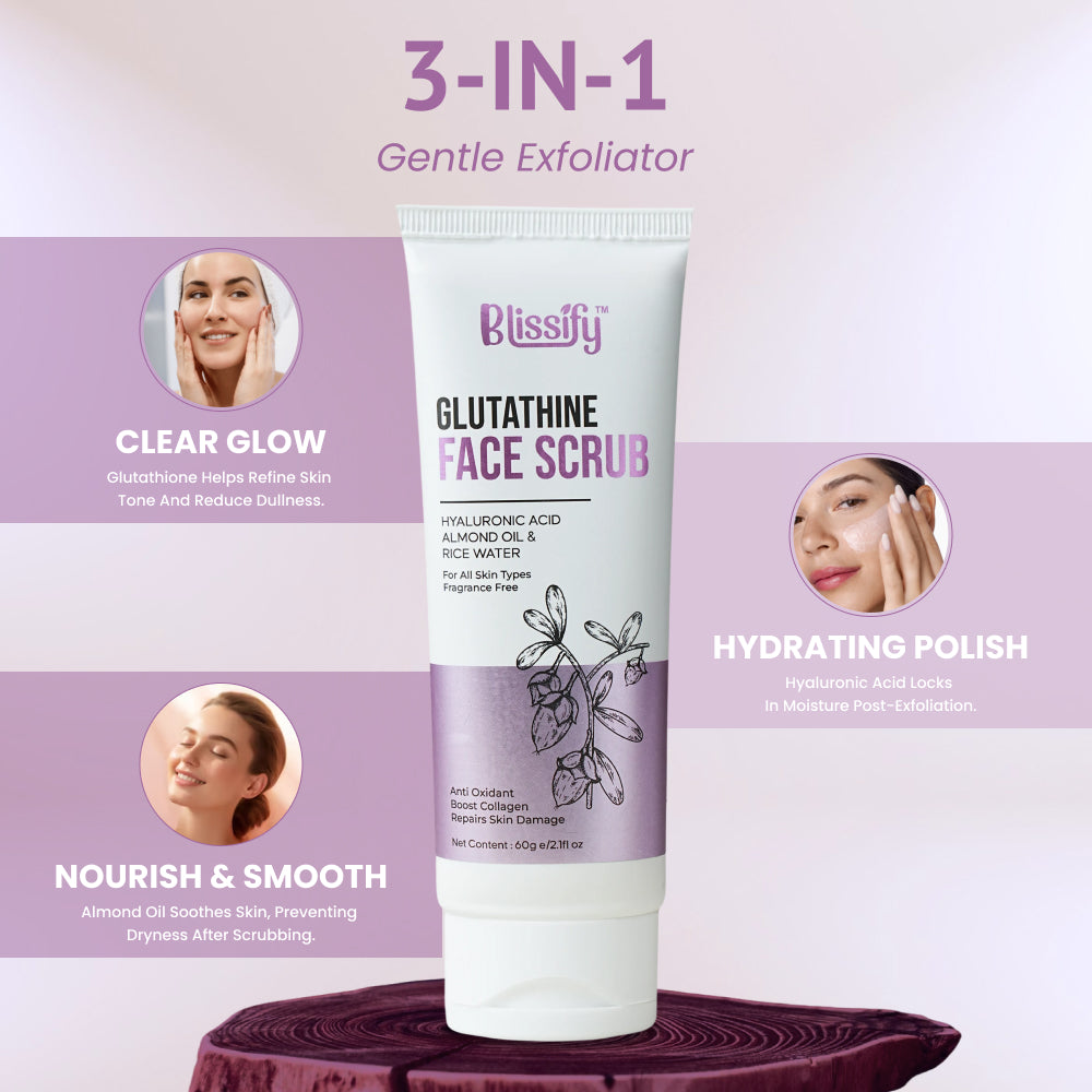 A gentle exfoliating face scrub with Glutathione, Hyaluronic Acid, and Almond Oil to brighten and hydrate your skin.