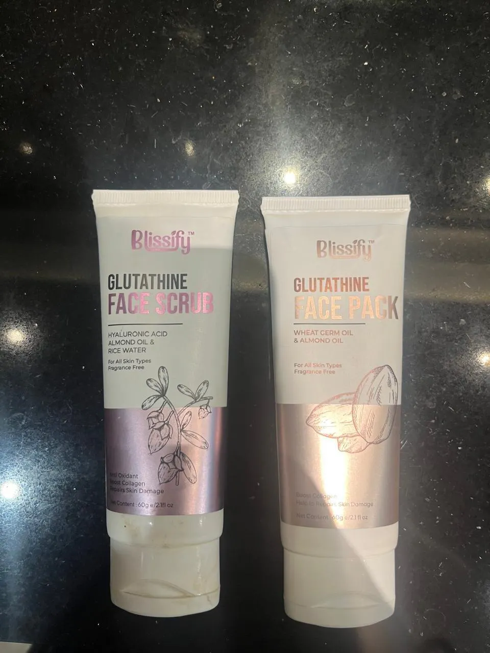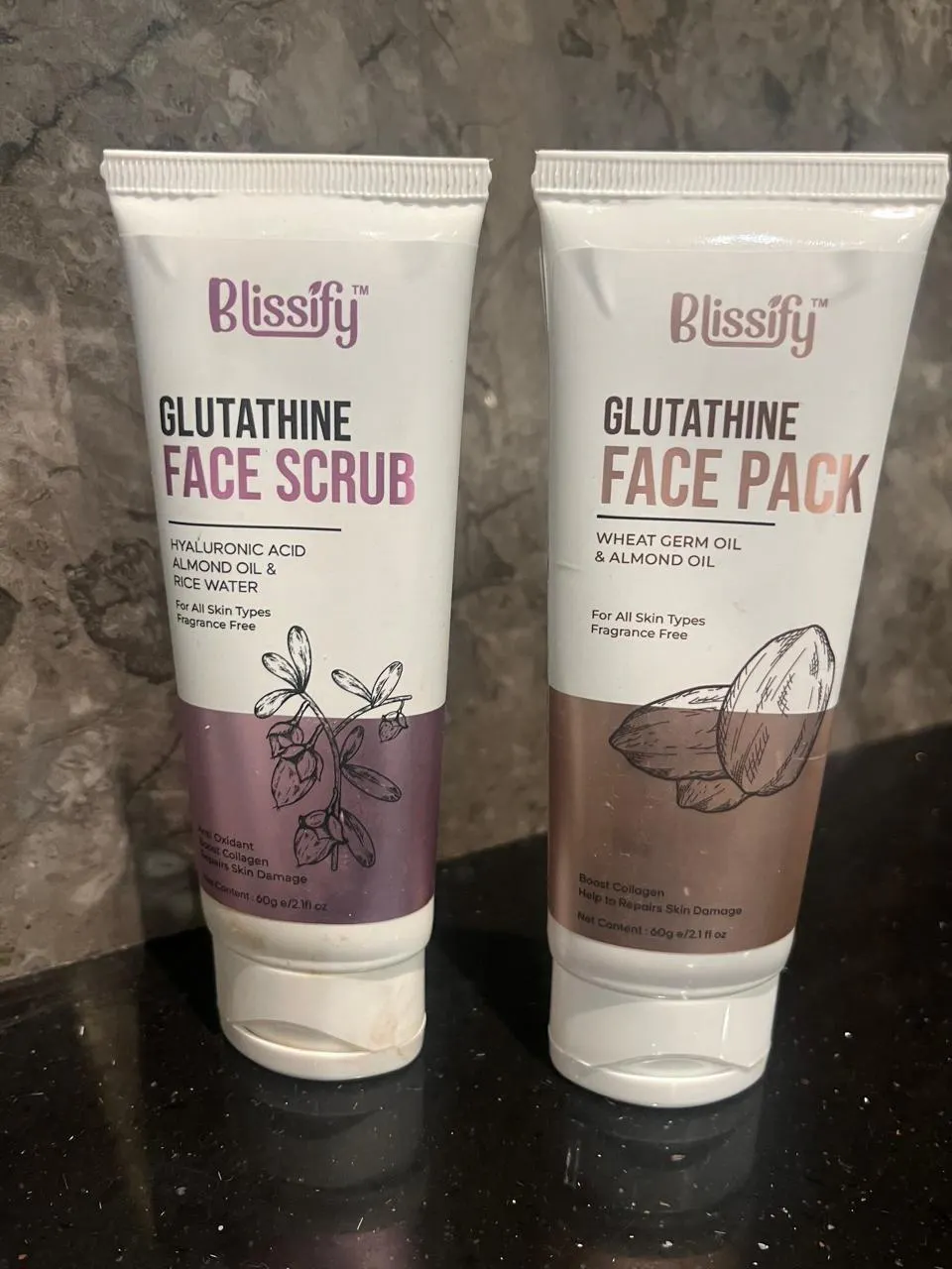 A gentle exfoliating face scrub with Glutathione, Hyaluronic Acid, and Almond Oil to brighten and hydrate your skin. A skin-brightening face pack with Glutathione, Wheat Germ, and Almond Oil to nourish and rejuvenate your skin.
