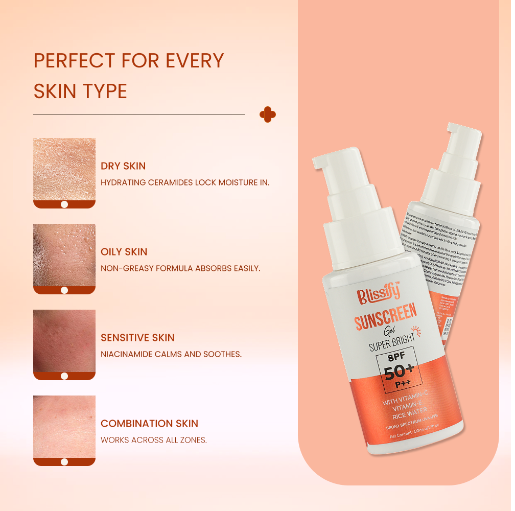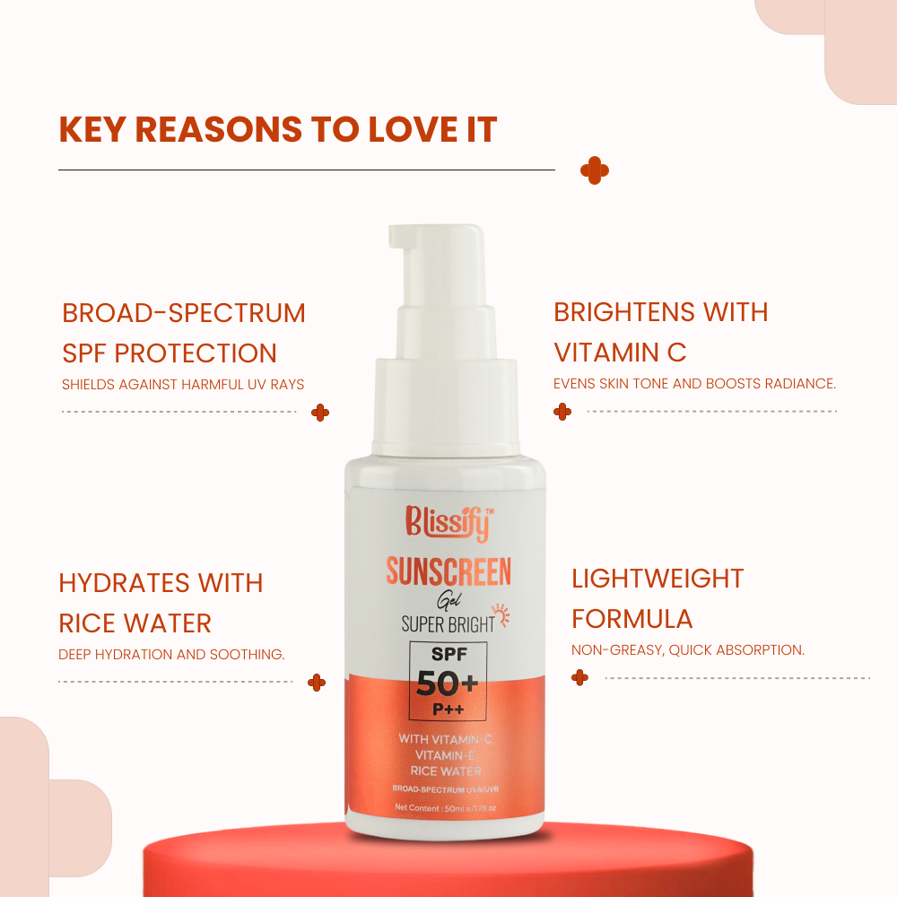 Blissify Vitamin C Sunscreen is a powerful broad-spectrum SPF sunscreen that offers ultimate protection from harmful UV rays. Infused with Vitamin C, Ceramides, Niacinamide, and Vitamin E, this sunscreen not only shields your skin but also brightens, hydrates, and repairs. Its lightweight formula absorbs quickly, leaving your skin feeling smooth and non-greasy.